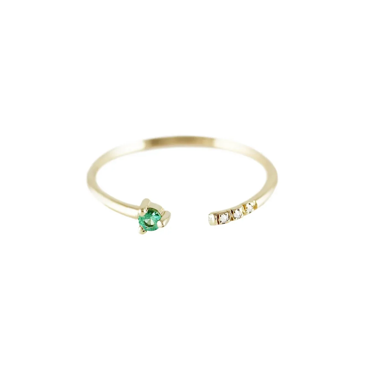 Anello filo regolabile aperto sulla parte frontale, con pietra verde unica su un lato e pietre sulle punte.