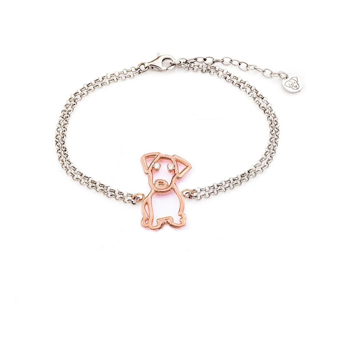 In argento 925 doppia catena di base e cane centrale rosè incastonato con zirconi bianchi.