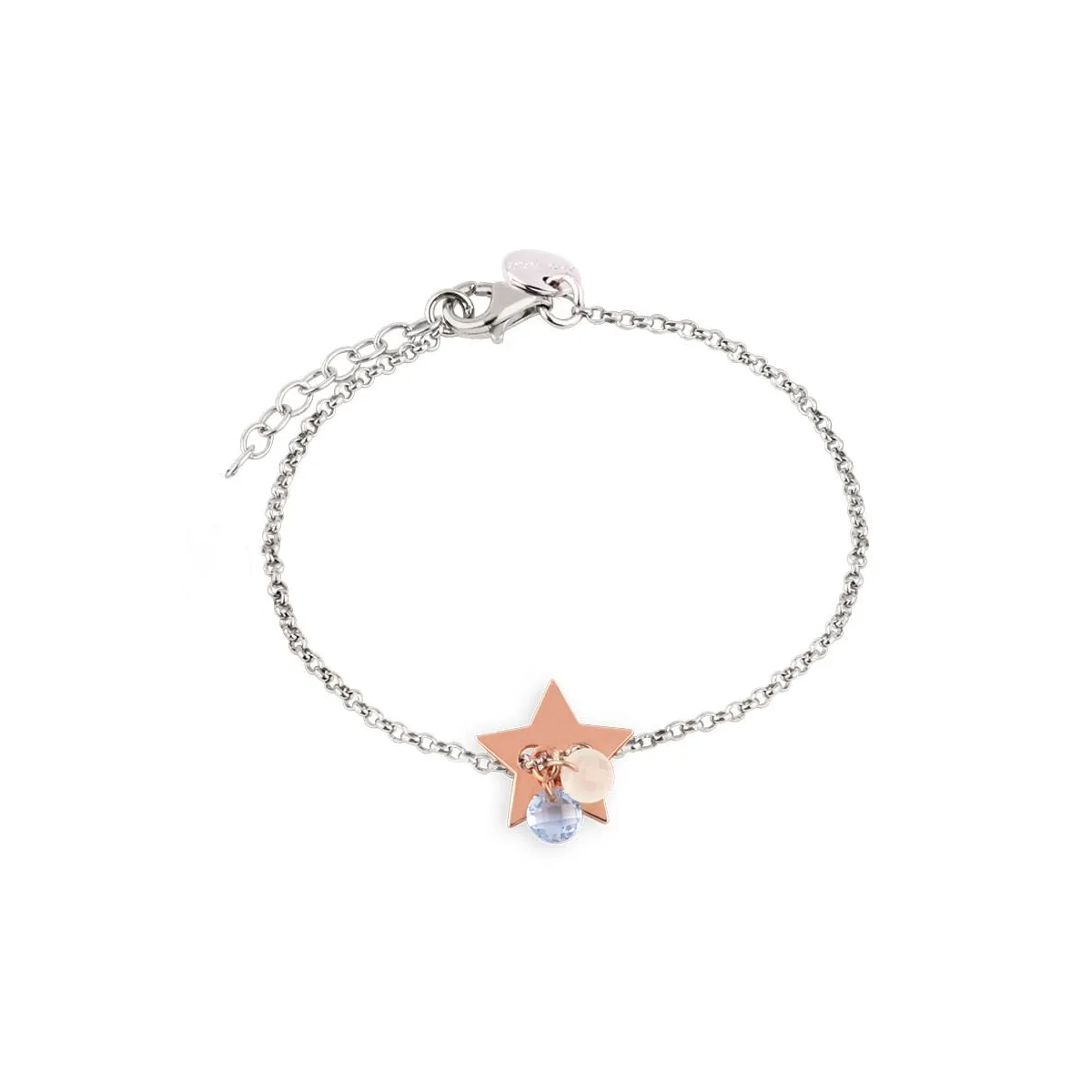 Bracciale Donna Jack&Co con catena rolò, bottone Stella placcata oro rosa, charms zirconi bianco e azzurro.