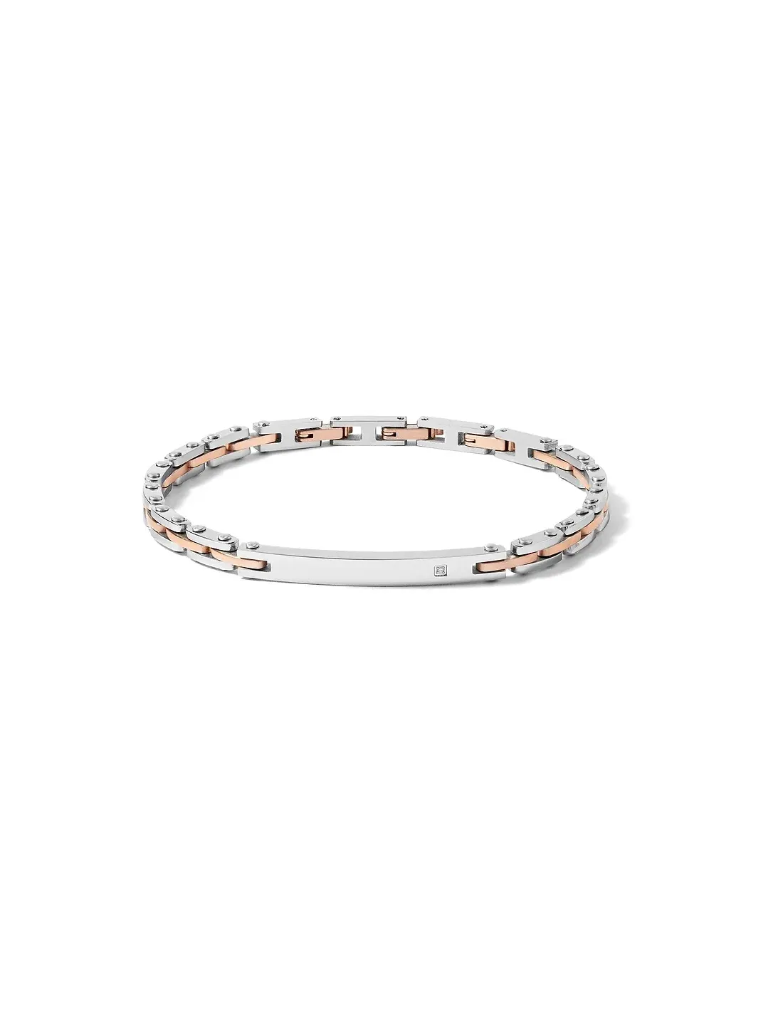 Il gioiello è caratterizzato dall'armonico accostamento dell'acciaio con il Pvd rosè e dalla presenza di un centrale impreziosito da un luccicante zircone bianco che lo rende elegante pur sempre restando su linee classiche e semplici.
