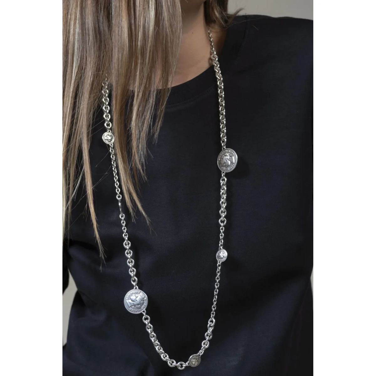Collana lunga con maglie e ciondoli a forma di moneta placcato argento.