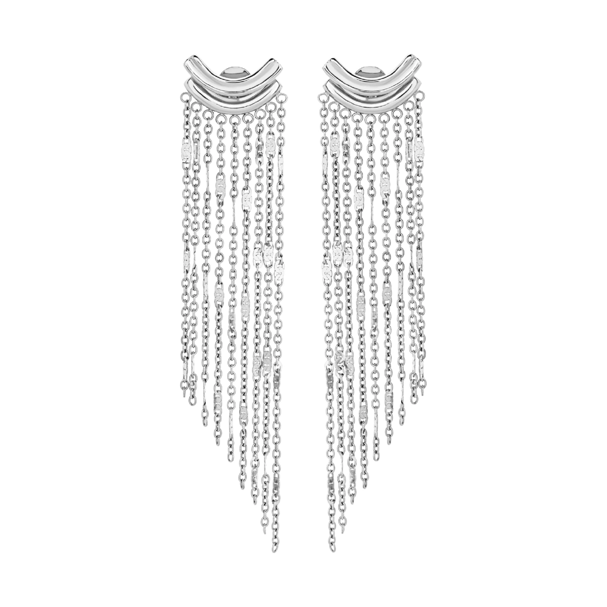 L'elemento al lobo dal design lineare ed elegante è abbinato a una cascata di micro catene sfaccettate che scivolano dolcemente lungo il collo, illuminando l'intero viso.